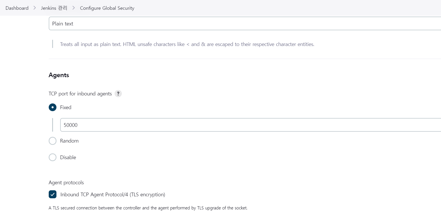 TCP port for inbound agents 를 50000번으로 Fix 합니다. (AWS 환경에서 구축하다보니, EC2 보안 그룹의 인바운드 규칙에 특정 포트를 열어두기 위해 Random이 아닌 Fix로 설정함)