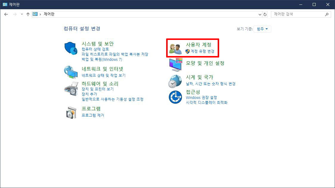 제어판, 사용자 계정 선택